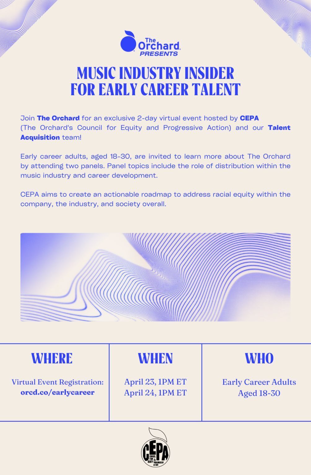 “For students or early-career adults, join us for an exclusive 2-day virtual event hosted by CEPA (The Orchard's Council for Equity and Progressive Action) and our Talent Acquisition team! Attendees are invited to learn more about career development and the role of distribution within the music industry.”
